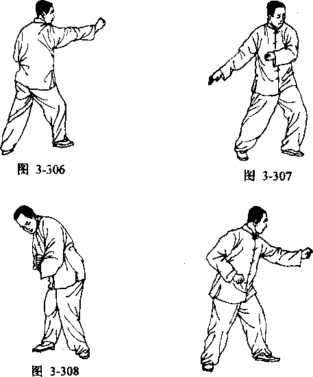 接着换势,右拳变掌拧臂向上挑拨,撤右步落于左腿后 向右闪身,左掌随闪身握拳不动(图3—307),右掌随右腿 上步向前盖出,随之用力下扣(图3—308)。身随左转一 周,右掌扣在左臂肘前转身握拳,左拳顺转式上左步向前方 打一截捶,此为右闪掌(图3—309)。