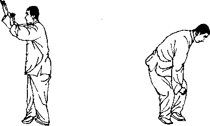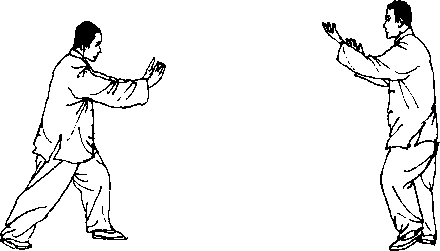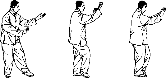 步摆动而进,待左脚上步时,双掌并齐,掌心向外,向前扑 出。然后右掌向身后穿,上左步,左掌向右臂下上穿过头转 身一周。双掌相合掌心向前,五指用力下握成拳按左膝下。 随即上左步双掌向前扑出。回到左蹿山掌。循环往复,多寡 自便。