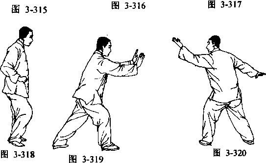 站好左七星势(图3—315),左掌不动,脚尖左摆,右 掌随右步向前迈由左掌腕下往前穿出。双掌掌心向上(图 3-316),随之同时外翻(图3—317),五指向前抓握成拳, 拳心向下屈肘拉回向胸腹两侧(图3—318)。同时右足和左 足交替向前迈三步。双臂随步摆动,然后变掌合右足向前迈 步时扑出(图3—319)。随即左掌向身后穿掌,左足随之向 后转身迈步(图3—320)。右掌由左臂下向上穿出,掌指高