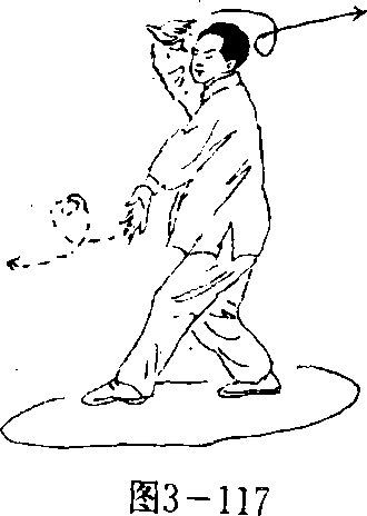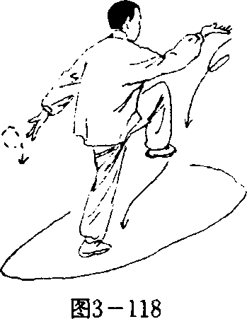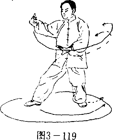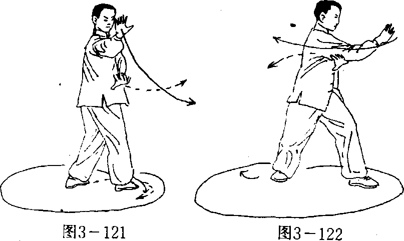 接上势,当沿圆周走转至左脚在前时,右脚往左脚前方横 行迈进一步,脚尖朝向圆心方向,左脚再往右脚前横迈一步, 左脚内扣,左脚尖亦朝向圆心;在两脚连续运动时右掌臂由立 掌向右再向左画弧后并经胸前由左臂上横掌击出,掌心朝外; 左掌移向右肘下面,眼看右掌(图3 — 122)。整个紫雁抛翦在 运动时两臂始终呈弧形运动,内含滚钻争裹之力;两腿始终屈 膝保持在一个水平上。动作要连贯,精气十足。