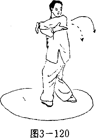 心朝上顺左臂下往左腋窝下平插,屈肘呈半弧形置于左臂下 方,两臂均含滚钻争裹之力;眼看左肩外侧(图3-120)。