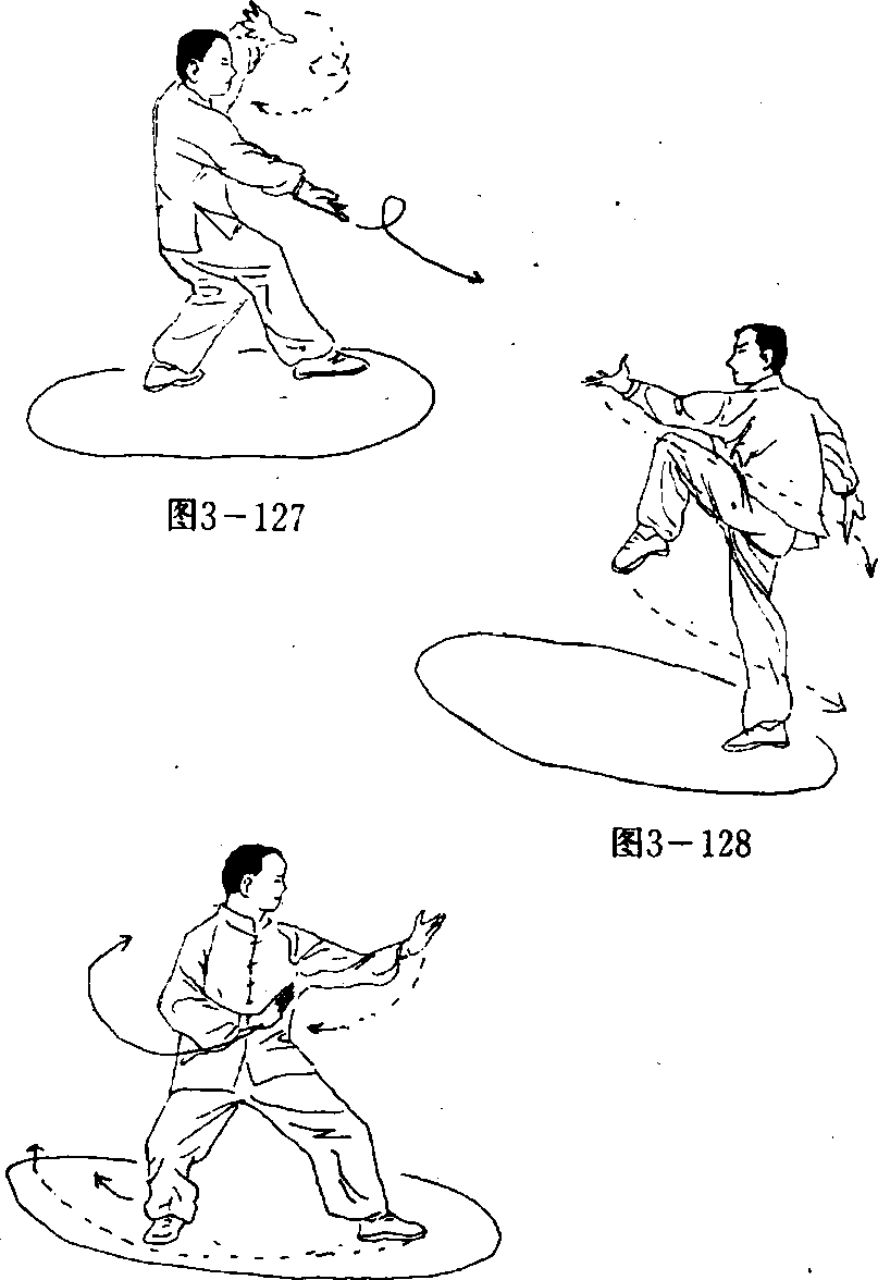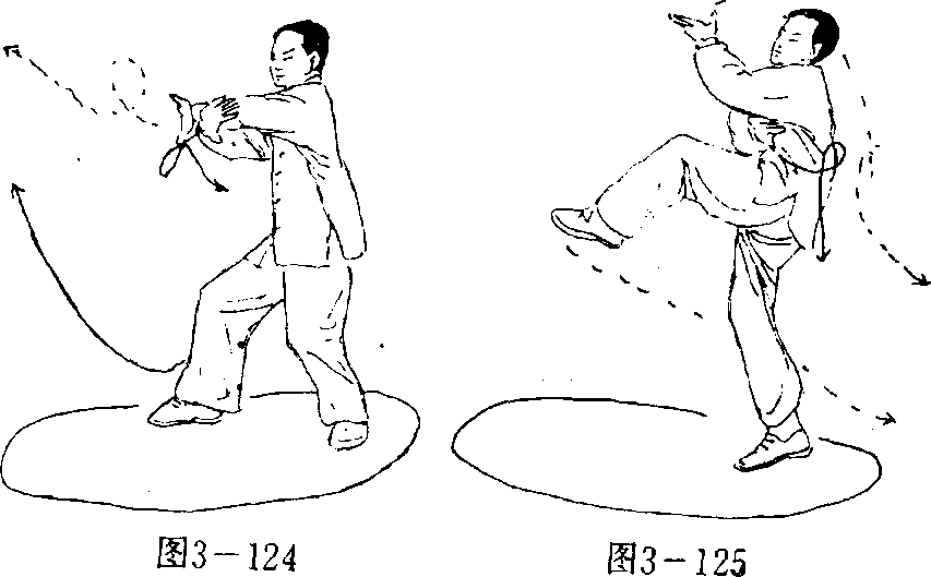 接上势,右左掌分别于胸前交叉画一圆圈后(图3- 124),左掌心如上经右臂上方前穿,同时,起左腿随左掌向前 踢出;右掌自然置于左肘下方,眼看左掌前(图3 — 125)。