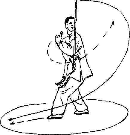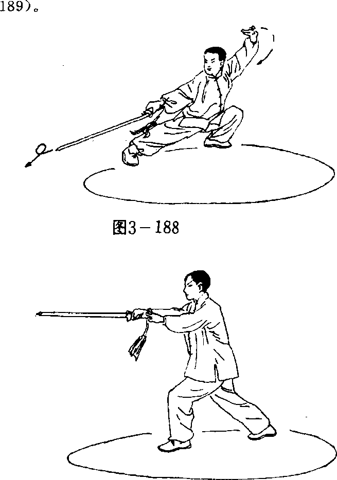 接上势,当持剑走转至右脚在前时,左脚前扣一步,同时 身体向右拧转,右手持剑乃成垂剑势往身体左侧画弧,剑尖朝 上垂立于左肩外侧,左剑指移至右腋窝下方,剑指朝下,眼看 剑尖,右脚摆,左脚迈步沿圆周走转一圈或数圈(图3 —187)。
