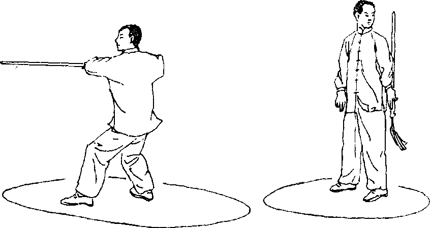 接上势,将身体重心移至右腿,左腿微屈,右腿屈膝下蹲 成三体步式,将剑交于左手(图3—190)。此时身体直立,左脚 并拢右脚,左手反握剑,剑尖朝上垂立于左臂外侧,右剑指往 胸前画弧后停于身体右侧,眼看前方,沉肩,气沉丹田,收势
