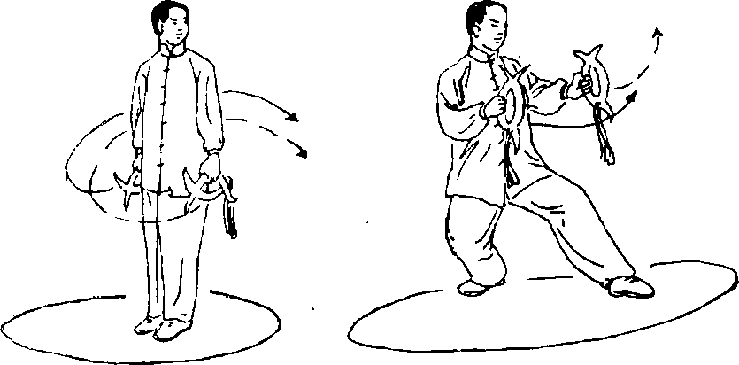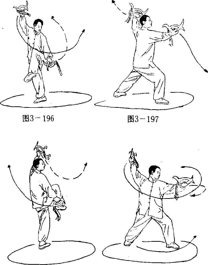 接上势,两手持钺同时由右往左画圆弧后置于身体左侧, 左手钺在上,右手钺在左钺下面,两钺刃均朝向圆心,两臂均 微屈呈半弧形;两腿微屈膝下蹲成三体步式;两手持钺沿圆周 走转一圈或数圈(图3 — 193)。