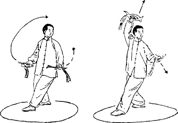 ' 接上势,在走转过程中,左手钺向内旋转勾挂后朝圆心方 向平行扎出,钺刃朝向圆心;右手钺亦同时往头顶上方画弧后