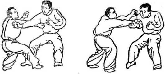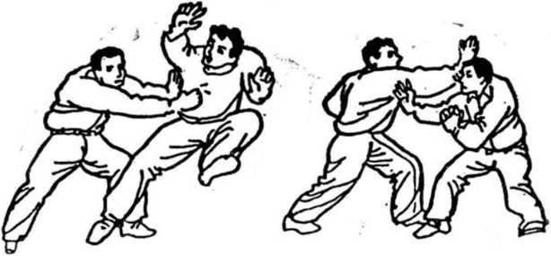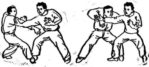 (1 )乙以右掌击甲前胸,甲速含胸空身以闪化其掌, 同时扭身形,以右手顺乙右臂外往下插(图45)。