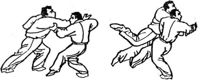 (2 )甲迅疾以右手掳扣乙右胸,同时右步变虚,以左 手兜其腋肩,借其扑力向右侧领带(图」9 )。