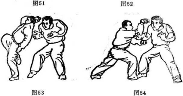 (1 )乙用右掌击甲前胸,甲速空身而虚右步,同时用 右手顺乙之右臂外由上往下掩缠其臂。待甲臂深入乙右腋处 时,速将右步踏实,右掌于心朝下,以四指截乙物惬 < 图 51) o