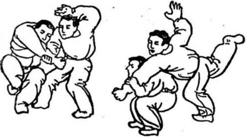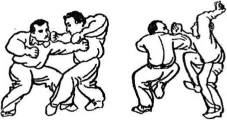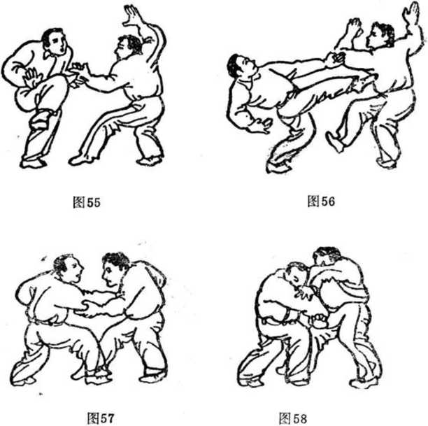 (3 )甲右臂上翻的同时,扣左步,下身形,再以左手 托乙之右臂,速起右腿(图59)。