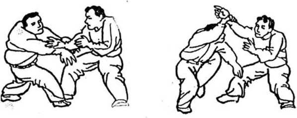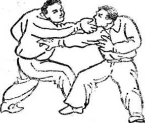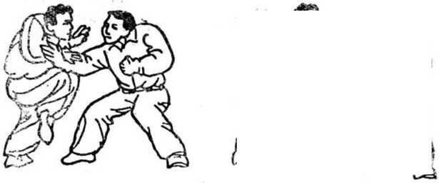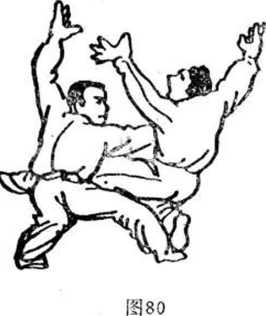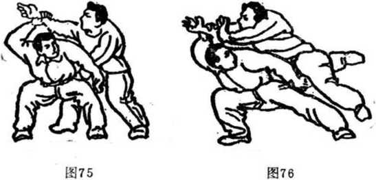 (3 )甲以胯贴乙小腹,再用左手反打其裆(图75)。