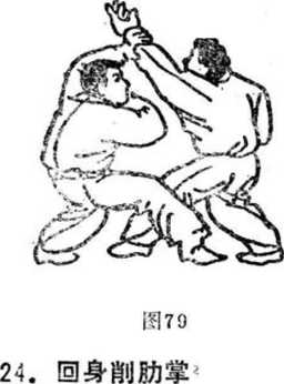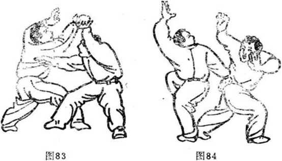 (4 )E[H同时急上左步,缩颈藏头,同时下身形,由乙 右臂下钻过,随即速提右腿,左掌向上穿,再以右掌削击乙 之右肋(图84 )。