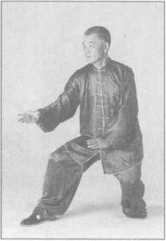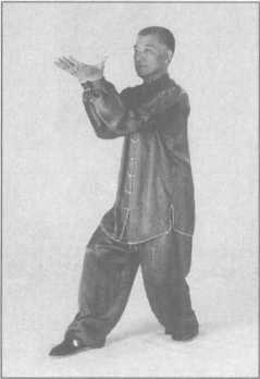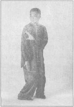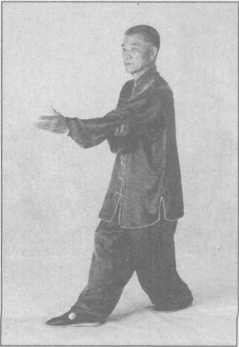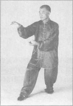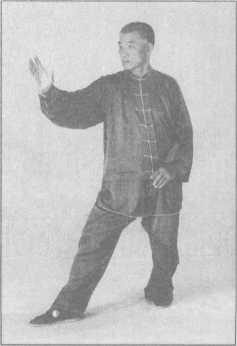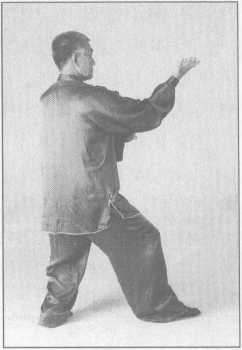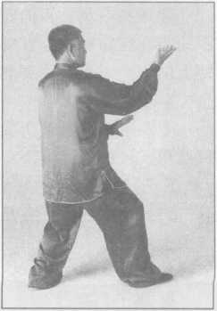(1)向右足的右前方上左足,左手自右臂下抓下,随之掌心向外置于腰后;右掌翻成 掌心向前,拇指向下时,经右肩上向面前推出,二目前视。(图3-4-74)