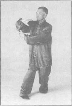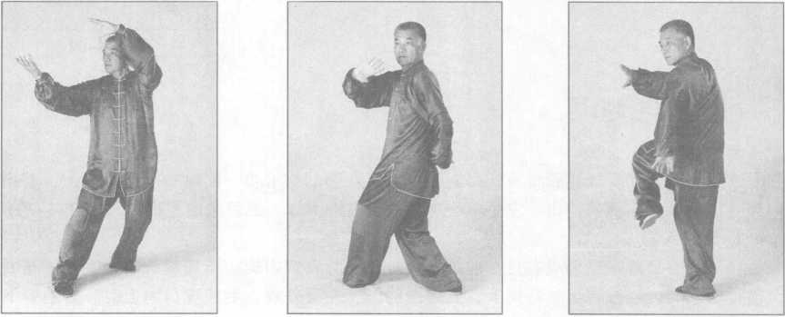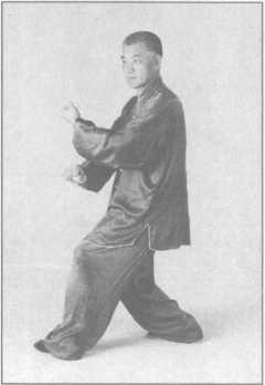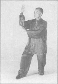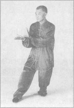 (2)跟左足仍成右足前左足后的三七步,同时左手自身后向上向前抡圆了,向前上方 劈落,小臂“啪”地一声劈在右手掌心内,以上动作要一气呵成,二目向前平视。(图 3-4-63)