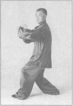 (2)上右足跟左足仍成右足在前的三七步,同时左臂内旋,屈指屈腕,自上至右至下 至左至前拧转一周,当拧转到掌心向下,五指向前时,右臂外旋,翻成虎口向上,自左臂 下向左手前钻出,以上动作要一气呵成,二目前视。(图3-4-72)