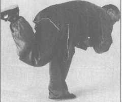 向右足后扣左足,右转回身,弯腰屈左膝,右足提起,足心向外向身后蹬出,右腿不 可蹬直,双拳配合右腿的后蹬前后也可以自然分开,二目注视右足动作。(图3-4-67)