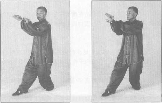 上右足跟左足仍成右足在前的三七步,同时,左臂外旋翻成虎口圆撑,掌心向上时掌 背向下沉,右手在左手上面内旋翻成掌心向下时,右掌五指向前向胸前插出,二目向前平 视。(图 3-4-77)