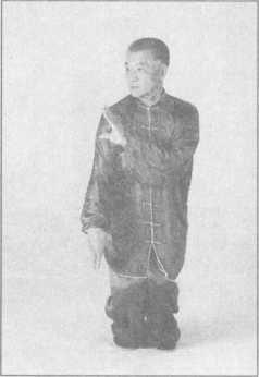 向身后撤左足,紧撤右足成并立步,右手五指向下,右臂垂于身体右侧,左手五指扶 在右臂上,二目拧头回视。(图3-4-61)