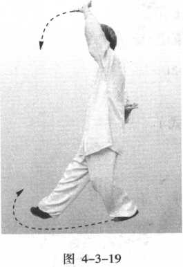 右臂贴肋后撤,内旋翻腕,掌心向上,虎口贴于右腰后 侧;左臂向左后外展,屈臂内旋撑于头左上方,掌心向前 (外)。同时,带动身体微左转,右脚抬起先向左脚方向收脚, 然后向前进步摆步。双目向前方平视(图4-3-19)。