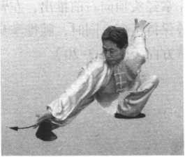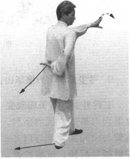 右臂内旋,右掌向腰右后掖,沿右腿外侧下插;左臂内旋, 拧臂后伸,掌心翻转向上,两臂尽量伸直,成一直线。同时,在