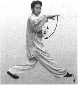 上动不停,两臂相错,左臂沿右臂下方向左前方穿掌,虎 口向上,拇指微扣,指尖领路,与眉同高;右臂坠肘屈臂回收 横于胸前,右掌置于左肘窝处,虎口向上,拇指微扣,指尖领 路。同时,随穿掌向右转腰,坐腰溜臀,沉肩坠肘。右脚向右 前大步跨出,落地踩实;左脚跟步虚点于右脚旁。目视左掌方 向(图 4-3-45 )0