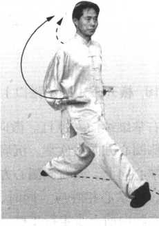 接上式,两臂相错,右臂沿左臂下方向右前方穿掌,虎口 向上,拇指微扣,指尖领路,与眉同高;左臂坠肘屈臂回收横 于胸前,左掌置于右肘窝处,虎口向上,拇指微扣,指尖领 路。同时,随穿掌向左转腰,坐腰溜臀,沉肩坠肘。左脚向左 前大步跨出,落地踩实;右脚跟步虚点于左脚旁。目视右掌方 向(图 4-3-44 )。