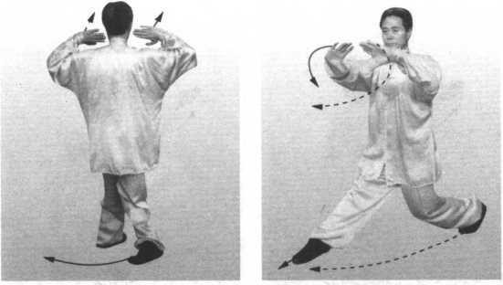 接上势,两臂内旋后撤 并外分上扬,然后屈臂收掌 于耳侧,掌心向前,指尖相 对。同时,带动身体向右后 转,重心移至右脚,左脚上步成过扣步,重心移至左脚,右脚 跟微上提。双目向前方平视(图4-3-41 )。
