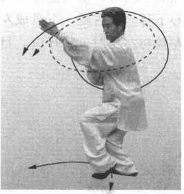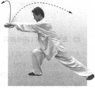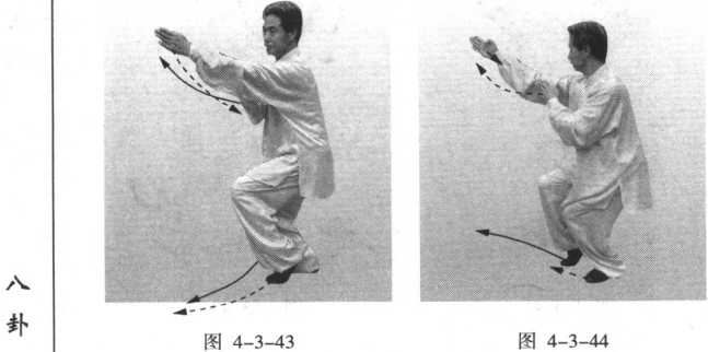 右前臂外旋成掌心向上, 两肘贴肋后撤,掌心向上夹 于两腰侧。随重心后移,稍 向右转身,右脚尽量向右摆 成过摆步。双目向前方平视 (图 4-3-40 )o