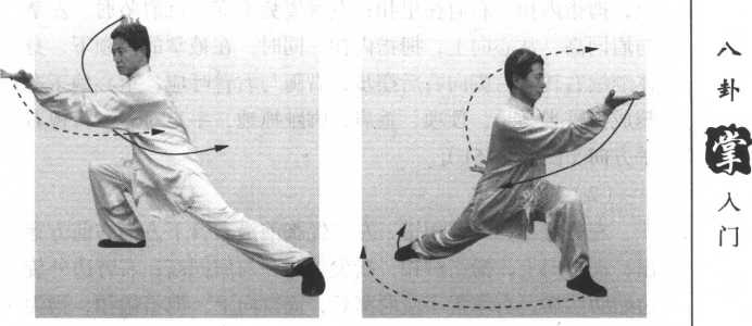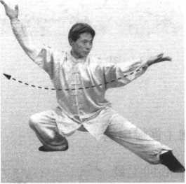 削掌的带领下,向左转身,重心水平左移成左弓步,左膝与右 肘相呼应。双目随右掌而动(图4-3-49 )。
