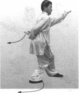 接上式,右掌向左平削,沉肩坠肘,掌与肩同高;左臂后 撤内旋翻腕,反手成掌心向上,虎口贴于左腰后侧。同时,在