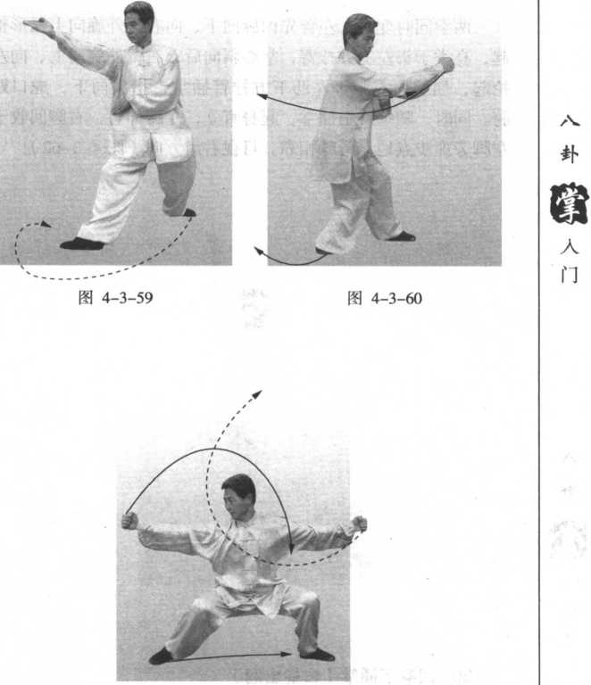 右臂向前下落至与肩同高。同时,身体立起随之右转,右 嚣 脚向右后摆步(图4-3-59 )。