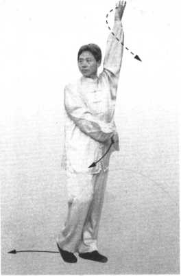 两拳同时变掌,左臂先内旋向下、向右再外旋向上弧形抡 起,高举于头左上方拧臂,掌心斜向后;右臂外旋向上、向左 抡起,屈腕向左腋、左肋下方拧臂插掌,指尖向下,虎口贴 胯。同时,随抡臂上插掌,起身直立,左腿伸直,右脚回收于 左脚旁虚步点地,两膝相靠。目视右肩方向(图4-3-62)。