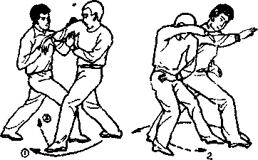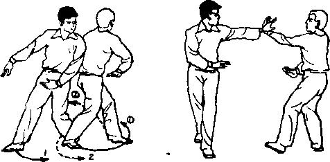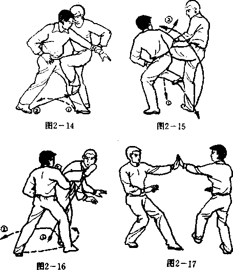 (4)甲右手从乙之右臂外侧上穿,翻手捋乙之右腕, 甲左足外跨一小步,身体右转45°,右足经左足附近,斜向插 入乙裆,右手捋腕,左手按乙右肘,向右前方斜向推乙(图 2—8)。