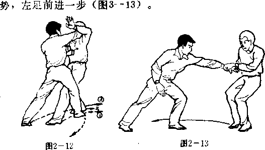(3)甲左足外摆,右足向乙之左腿外侧上步,脚尖里 扣;与尼同时,甲右手从乙之左臂下穿入,翻手高捋乙之左 臊,以左掌撞击乙之前胸(图2—12) o