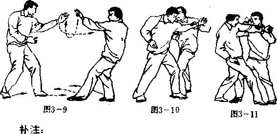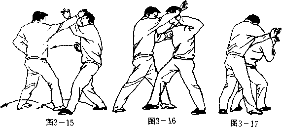 设想敌我左脚在前右脚在后拉开战局(图3—6) 0敌以 左掌击我前胸。我右脚向右外跨一小步,而左脚急速从敌左 腿外侧进步,我以左腿绊住敌之双腿;与此同时,右仰掌里 托敌之左肘,左手急从敌左8S下钻入并上穿(图3—7),以左 臂圈抱敌之前胸与颈部,左手扣住敌颈之左部,右手就势抓 住敌头发|右扭身以我之左胯外挤敌之左胯,得势后我身体用 力右扭双手(臂)用力缠抱,敌被缠绊必向后仰跌(图3—8)。