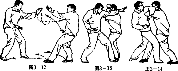 设想敌我左脚在前右脚在后拉开战局(图3—12),敌以 左掌击我前胸。我右脚速向敌左腿外进步抢位,左脚尖立即 点踢敌之左胫骨(迫敌左脚后撤一步,与此同时,我屈右小 臂里格敌之左臂,而左手在左脚踢胫同时从敌之左臂外上穿 乂图3—13),并马上屈左臂以左立肘之肘尖从敌左臊根处钻 人,然后随着左脚插敌裆而进的步势(左脚进一大步,右脚跟 进半步),以左肘斜顶敌之左肘,以左小臂斜挤敌之左膀。 敌被顶挤必向后仰倒(图3—14)。