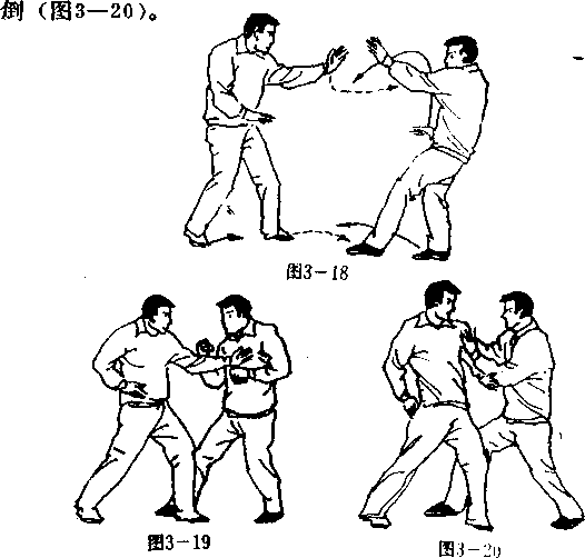 3 —19),并立即将左立掌附于右腕期助力,与右腿斜踵的同 时,以右小臂猛撞敌胸。敌上被挤下被绊,被击后必向后仰