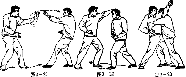 设想敌我左脚在前右脚在后拉开战局(图3—21)。敌以 左摆拳(又名单插花或单锋贯耳)击我右太阳穴(图3—22)。 我右脚从敌之左腿外进步抢位,左脚跟进半步,与进步的同 时我低头下伏身形从敌左臂下钻过,并以左平肘向前拦撞敌 之左胸部,敌必受伤焉(图3—23)。