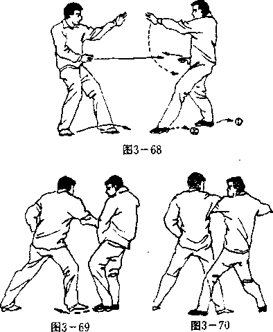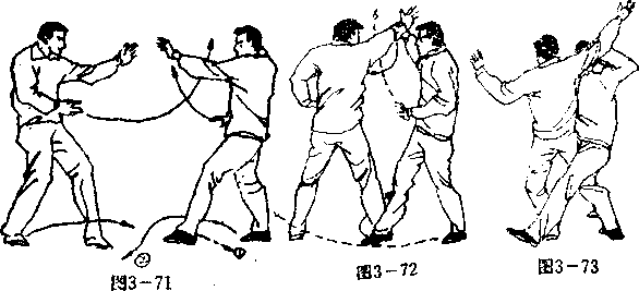设想敌我左脚在前右脚在后拉开战局(图3—71)。敌进 右步以右掌击我头部,我左脚先后撤一小步,右脚急向敌右