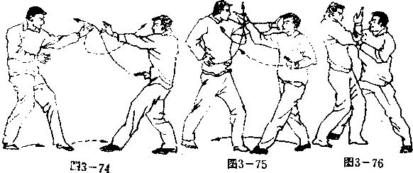 设想敌我左脚在前右脚在后拉开战局(图3—74)。敌以 左掌击我面门,我右仰掌速从敌左臂内侧上穿,以右臂中节 (右肘部)外挤敌之左臂,而以右掌梢节(右仰掌)上穿击 敌之双目(图3—75)。敌被穿急用右臂上架我之右小臂,我 右手就势下翻掳按敌右腕,而左手附按敌右肘,与此同时, 我右脚急从敌左脚外上步以右小腿斜踵敌之左小腿;双掌向 我右前方斜向推敌,敌因下腿挨绊上体被推,必向后仰倒