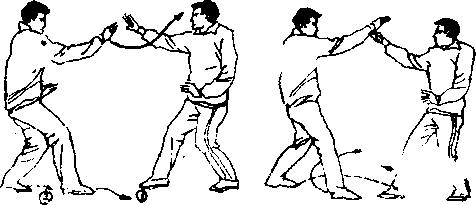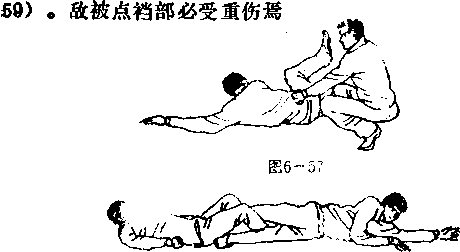承上势,当我用三星落地破解敌之挫腿挫骨时,敌右腿 猛缩又以右足向我胸部蹬来,而敌左脚仍然勾住我之右小腿 (图9一57).此时我立即作空中左扁摔动作,在空中右膝 外格敌之右腿(图6—58),并以右脚尖点踢敌裆(图6—