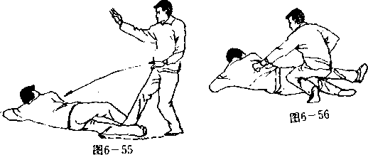 设想敌我双方右腿于前左腿于后拉开战局(图6—53)。 敌右探掌向我面部虚刺(图6—54),并立即缩回,与此同 时,做原地左扁卧以左脚尖勾住我右小腿,以右脚猛蹬我之 右膝,以挫鹅腿(即扣腿挫骨)向我进击(图6— 55) o当 敌右脚蹬来时,我左脚立即上步,两腿全蹲,以左膝外顶敌 之右胭,同时左拳下击敌右大腿,右拳砸击敌右脚面(图: 6—56) o