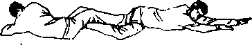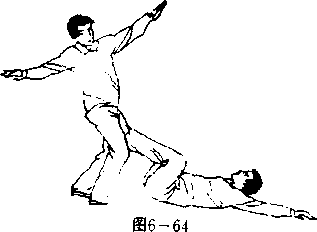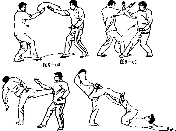 设想敌我双方右腿于前左腿于后拉开战局(图6—60)- 敌右足外绕向我右足外抢位,以右反背掌击我之头部,引我 右手上格(图6— 61),并突然上体左转下俯以右足侧踹我 右腋下(图6— 62)。当敌腿踹来时,我突然仰身倒卧,并 屈提双腿(图6—63);当敌腿一过中门露出空裆时,我两 手左右直臂开摆,以双脚猛蹬敌之胸腹(图6—64);敌被蹬 必仰身后倒。