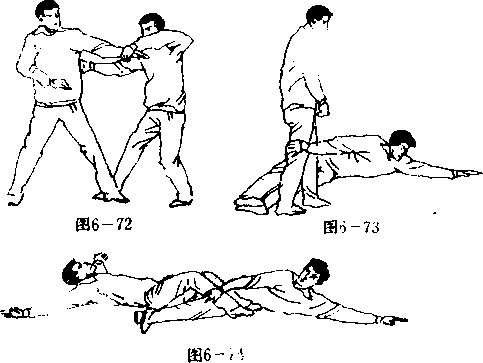 6—73);然后,猛向右滚身,敌被滚缠必仰身后倒(图6—74)。