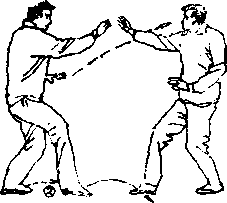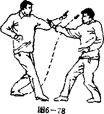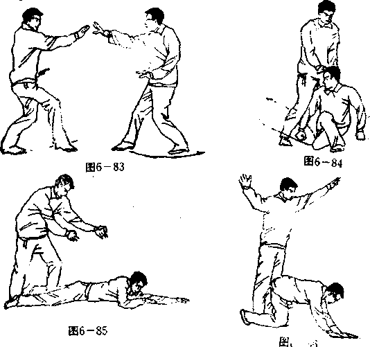 设想敌我双方右腿于前左腿于后拉开战局(图6—83)。 我左转体180°,转身进右盖步,眼右视敌方;敌进左步, 双撞掌向我后背击来(图6—84)。当敌掌击来时,我下蹲 身形使敌双撞掌走空。紧接着我双足蹬地而起猛向身后跌倒 (俯卧),随着后跌身势两腿伸直并分开,将敌双腿紧紧夹 于我两腿中间(图6—85)。紧接着两腿屈膝,以臀部猛后 顶敌之双膝(图6 —86).敌被顶必向身后跌。