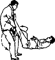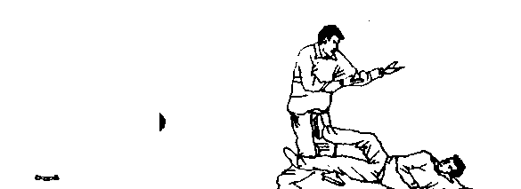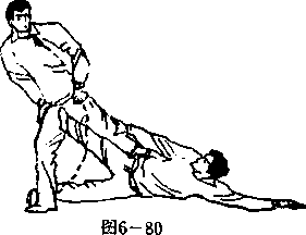 承上势,当敌后腿被我左脚勾住,我以右足上蹬敌裆 时,敌忙以双俯掌下按抓我之右脚时,我身体立即右滚,右 腿屈膝回收,再以左足猛蹬其头部(图6—81)。敌双手上 封我左脚时,我又左滚身,左腿以弧形下落,又从敌右胭外 勾住敌右膝胭窝,仍以右足蹬其裆部(图6—82),敌被蹬 必仰身后倒。