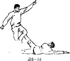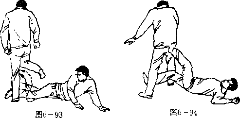 承上势,当我用白猿坐洞进击对方时,敌右腿提起想瞪 一击我之后背(图6—93).我俯身后卧马上变空中右滚身, .屈右膝外拦敌之右腿,以左足上挑敌裆或正蹬敌之臀部(图 94),敌被蹬必向其身前俯跌。