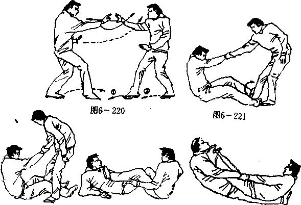 设想敌我右胭于前左腿于后拉开战局(图6—220)。我 右撞掌向敌胸击去,敌双手抓住我之右腕,做后滚翻动作, 同时,双手猛拽我之右臂,左足截蹬我之右胫骨,右足挑蹬 我之小腹,意欲以兔子蹬鹰之招势翻捧于我(图6—221)。在这 种情况下,我急屈膝下蹲,提右足里绕并反踏住敌之左胭 (图6—222),同时,屈左膝先里绕后外摆并挤掉敌右腿之攻 势(图6—223)。继而身体向前纵跃,以臀猛坐砸敌之小 腹,双足猛正蹬敌下巴,向后双手左右分按敌之双大腿跟 《图6—224)。散被坐蹬,小腹及下巴必受重伤焉。