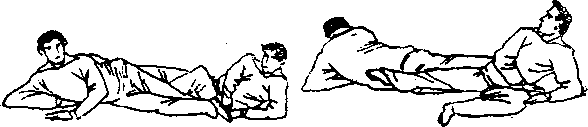 承上势,当我用陨星砸月进击对方时,敌急以黑驴打滚 之招势向左右滚逃。此时我立即变左右扁卧动作以左右脚猛 蹬敌之后背或后脑(图6—233、6-234) o敌亦会重倒重 创。