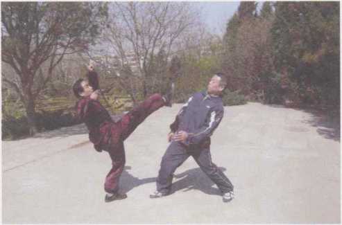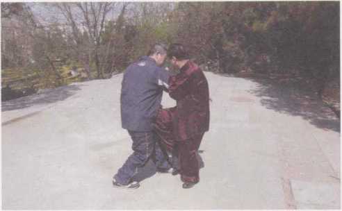 动作说明: 设对方用右掌击 我,我上左步 闪开对方右掌, 同时上右步左 掌外旋前伸, 化贴对方右肘, 右掌外旋于左 掌下翻压对方 右臂,上右足, 双掌同时向前 上推击对方下 颌(图 8—1、2、 3 ),同时提右膝 撞击对方裆部 (可撞击腹部), 如对方撤步则顺 势踢其胸(图 8-4、5 b左右 式动作相同,唯 方向相反。